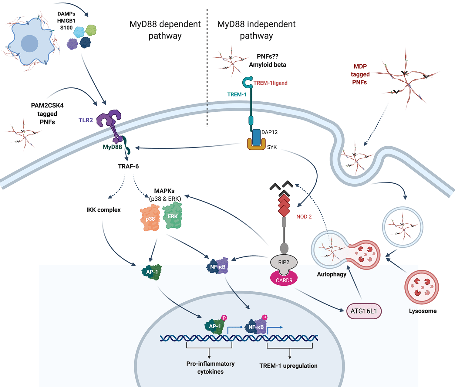 Due to their profound immunostimulatory effect on DCs, researchers have combined TLR agonists with peptide nanofibers to improve the functional spectrum of vaccine-elicited responses. However, the mechanisms of innate immune activation by these combinations have not been elucidated. A strong rationale for combining peptide nanofibers with PAMPs is based on their individual mechanisms of action and regulatory approval of DAMP-PAMP combination adjuvants (e.g. AS04). We are interested in understanding how molecular mechanisms of DAMP-inducing peptide nanofibers and TLR agonist combinations orchestrate innate immune signaling and responses that are complementary, synergistic, or inhibitory for balancing immunogenicity with safety.