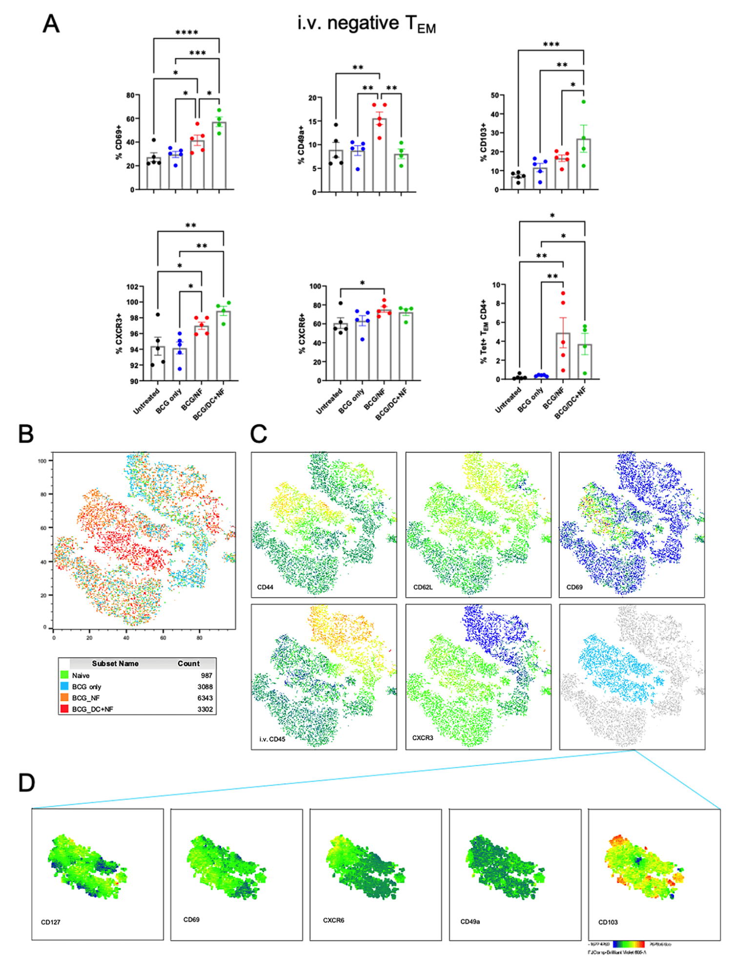 Numerous studies have shown that T lymphocytes are a critical component of a protective immune response against Mtb infection. More specifically, a subset of memory T cells identified as tissue-resident memory T cells (TRM) were demonstrated to have protective effects upon adoptive transfer into Mtb-infected animals. These cells are characterized by surface markers, most notably CD44hi CD62Llo CD69+ CCR7-, as well as tissue-homing markers, and are shielded from i.v. anti-CD45 staining. Importantly, TRMs have been correlated with protection in a study demonstrating the protective efficacy of intravenous BCG in NHP models of tuberculosis infection.