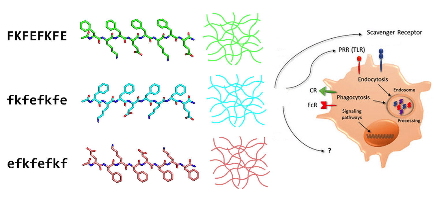 Preliminary studies on mechanisms of action indicate that, unlike pathogen-associated molecular patterns (PAMPs) (toll-like receptor (TLR) agonists), peptide nanofibers do not cause DC maturation but up-regulate scavenger receptors and facilitate the release of damage-associated molecular patterns (DAMPs) related to osmotic/oxidative stress. The key advantage of peptide nanofibers over emulsion adjuvants like alum or QS21 is that the primary sequence of the self-associating peptide can be designed to control the physicochemical features such as morphology, charge, chirality, or hydrophobicity, which are key contributors to adjuvant activity.